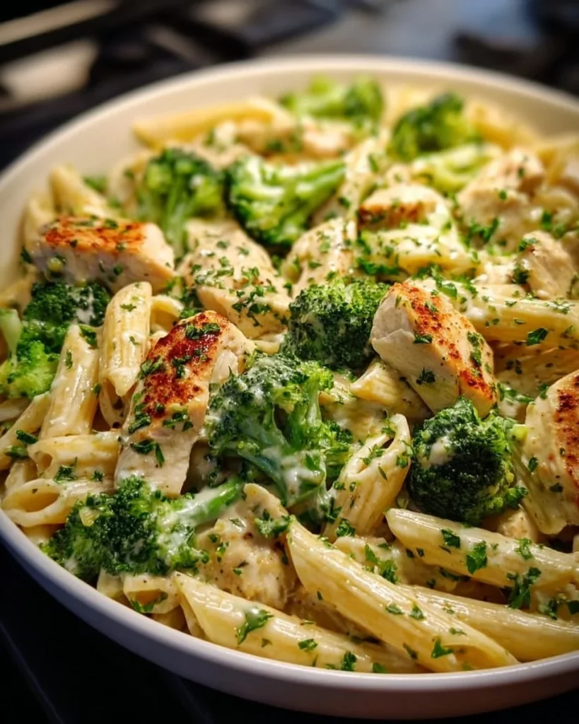 Creamy Broccoli and Chicken Penne combines tender chicken, vibrant broccoli, and a luscious creamy sauce wrapped around perfectly cooked penne pasta, making it a delightful weeknight dinner.Ingredients