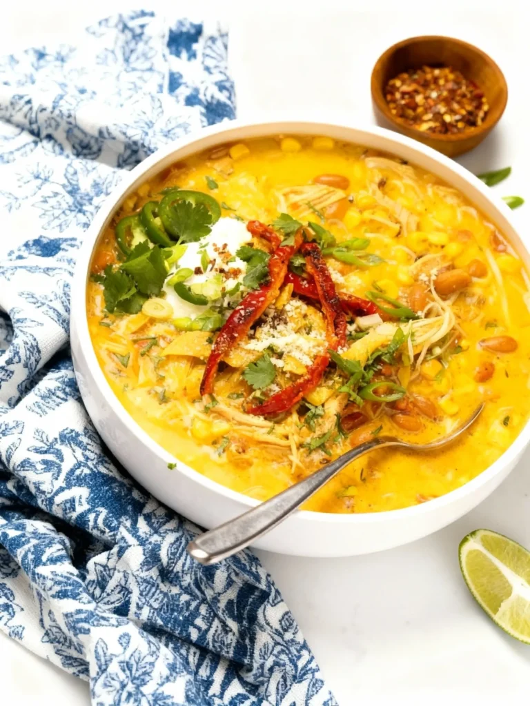 What are the best toppings for chicken chili? Toppings really take this chili to the next level. Some popular options are: shredded cheese (cheddar, Colby Jack, pepper jack for a kick, etc.), a spoonful of sour cream or Greek yogurt (adds a cool, creamy element), diced or sliced avocado (for creamy texture and healthy fats), fresh cilantro or parsley on top (for color and freshness), sliced green onions or chives, pickled jalapeños for some tangy heat, and a squeeze of lime juice to brighten everything up. And don’t forget something crunchy – tortilla chips, corn chips (like Fritos), or even saltine crackers on the side. There’s no wrong answer here. Set out a little topping bar and let everyone personalize their chili bowl. It’s an easy way to make a simple meal feel special.