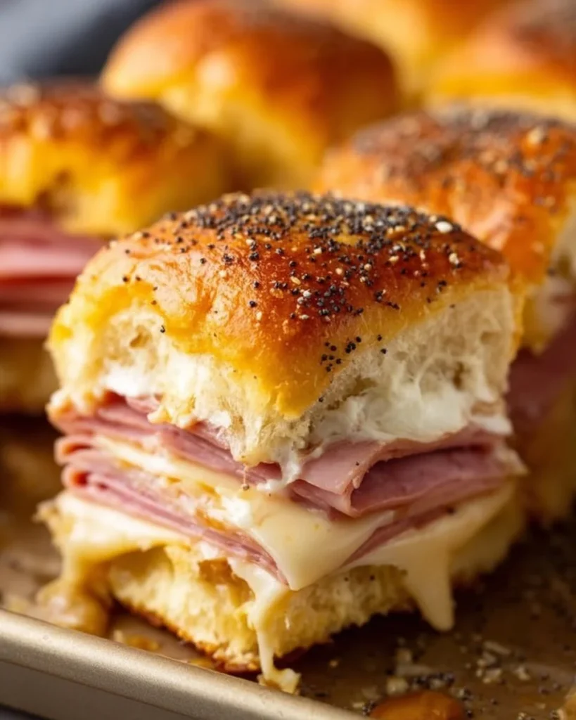 These ham and cheese sliders are a crowd-pleaser, featuring savory layers of ham and gooey cheese, drizzled with a flavorful butter mixture.Ingredients